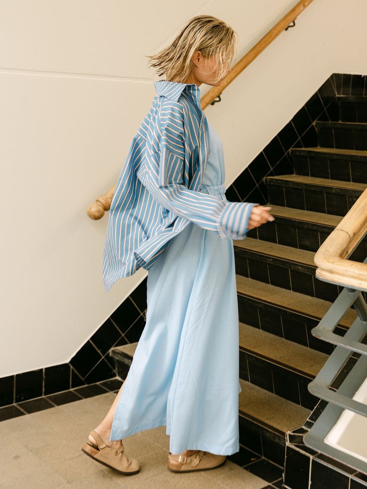 - Het model is 1.76m lang en draagt maat S
