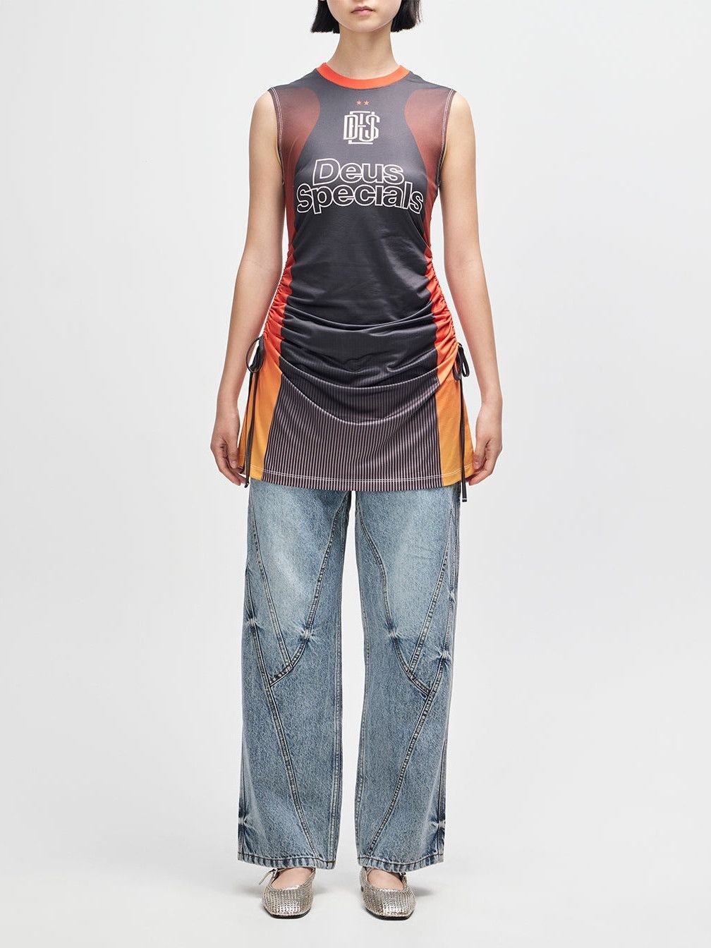 - Het model is 1.76m lang en draagt maat XS