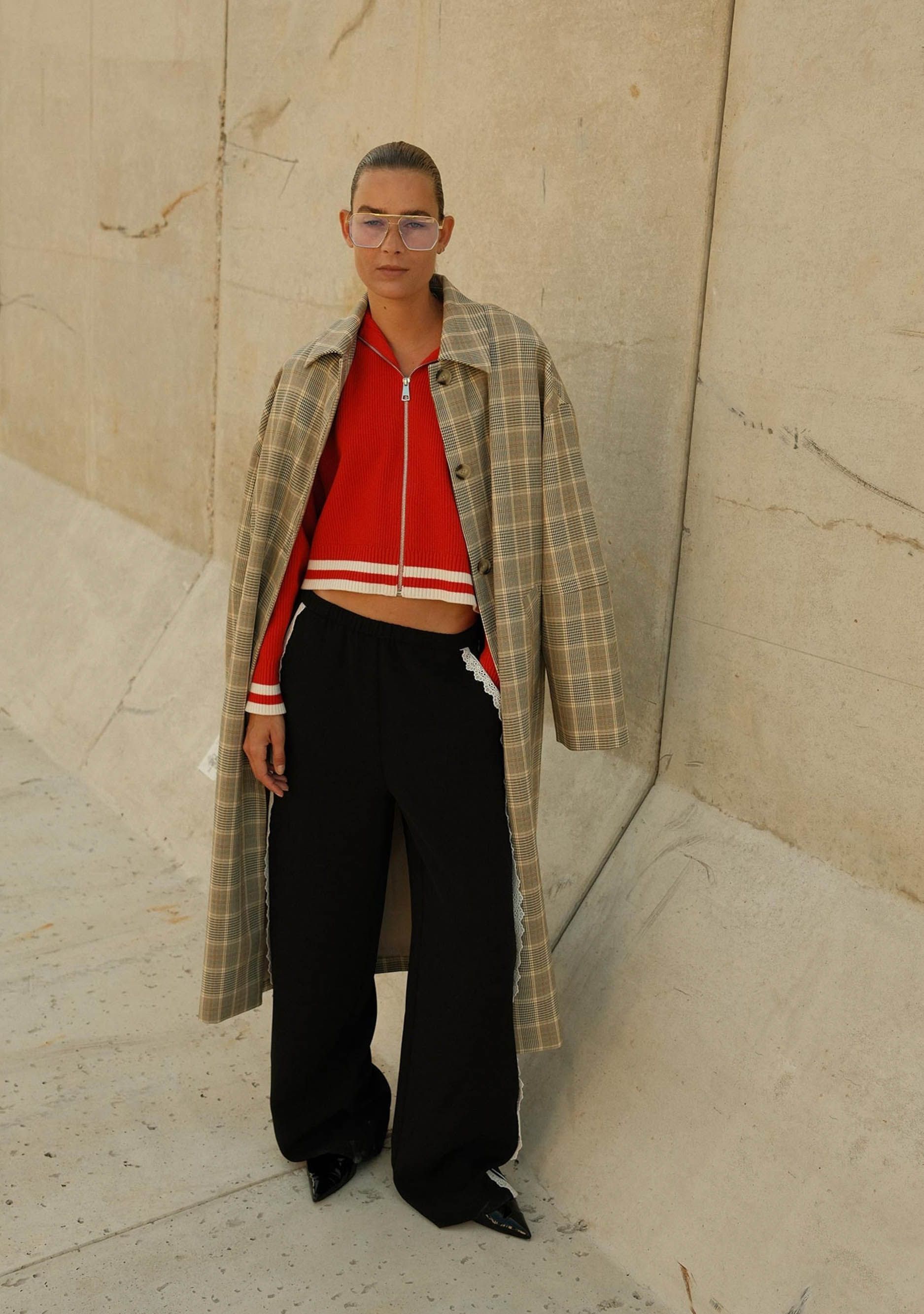 - Het model is 1.76m lang en draagt maat 36