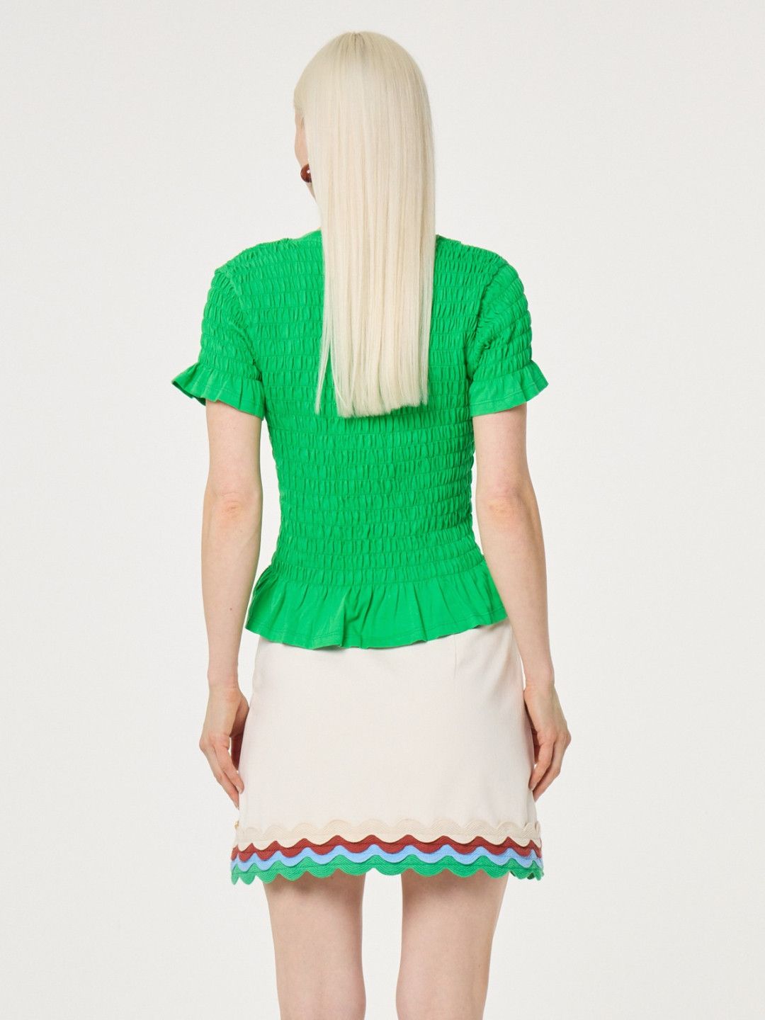 - Het model is 1.76m lang en draagt maat S
