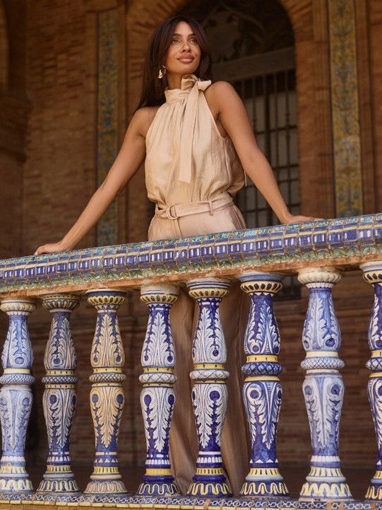 - Het model is 1.76m lang en draagt maat S