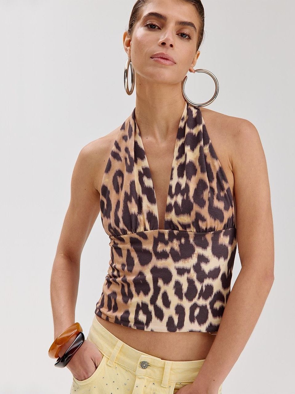 - Het model is 1.76m lang en draagt maat S