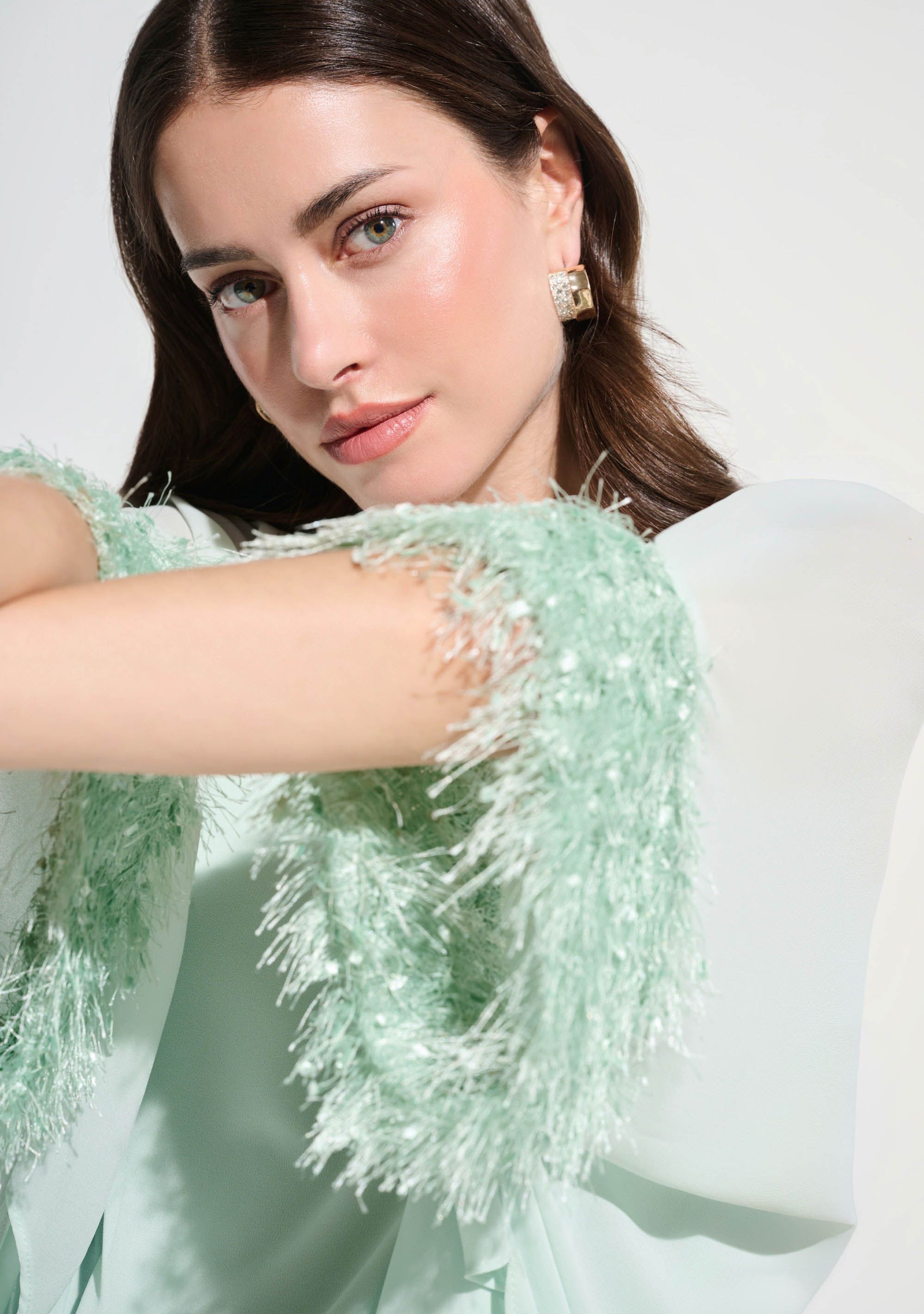 - Het model is 1.76m lang en draagt maat 40