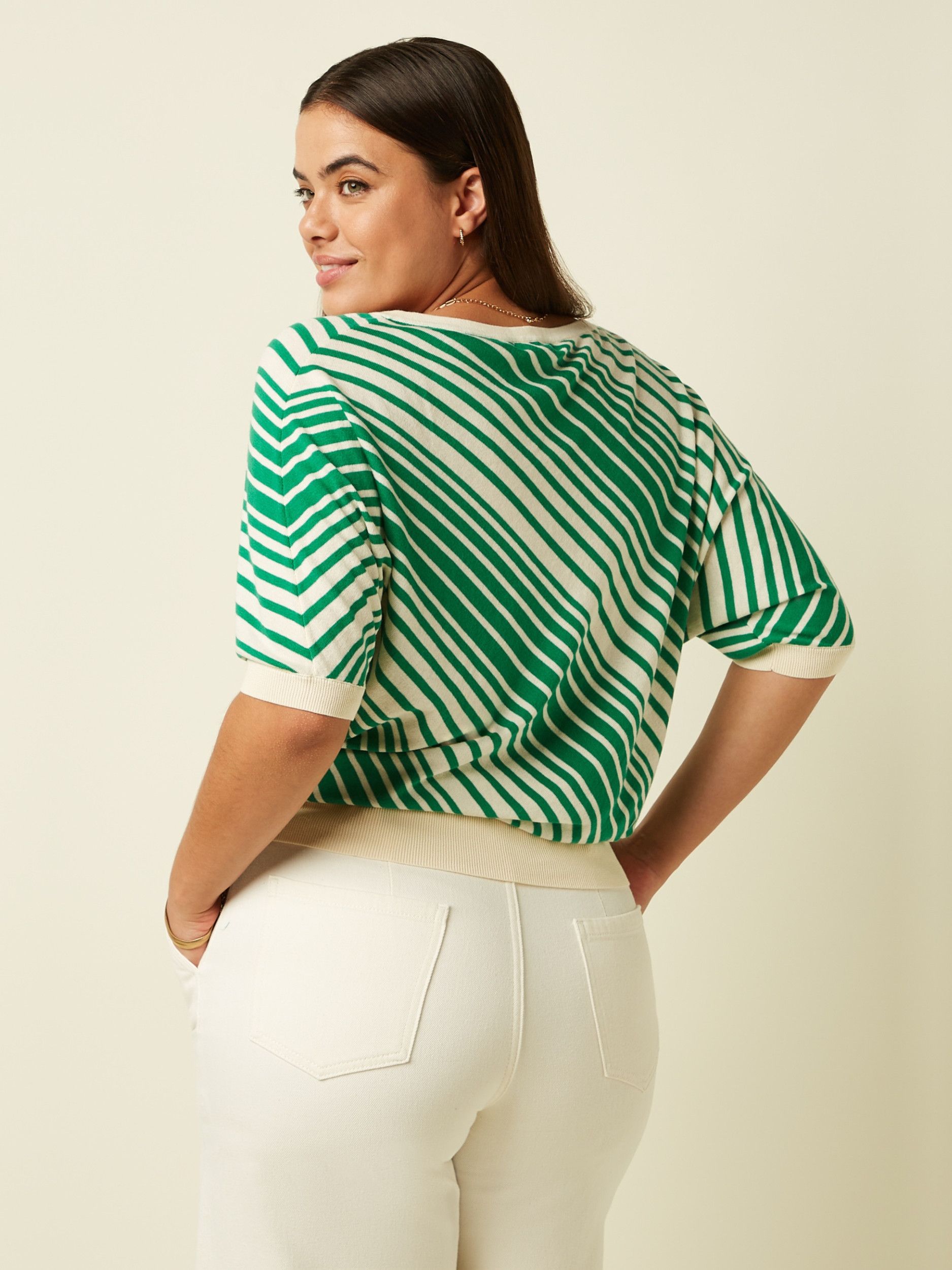 - Het model is 1.76m lang en draagt maat S
