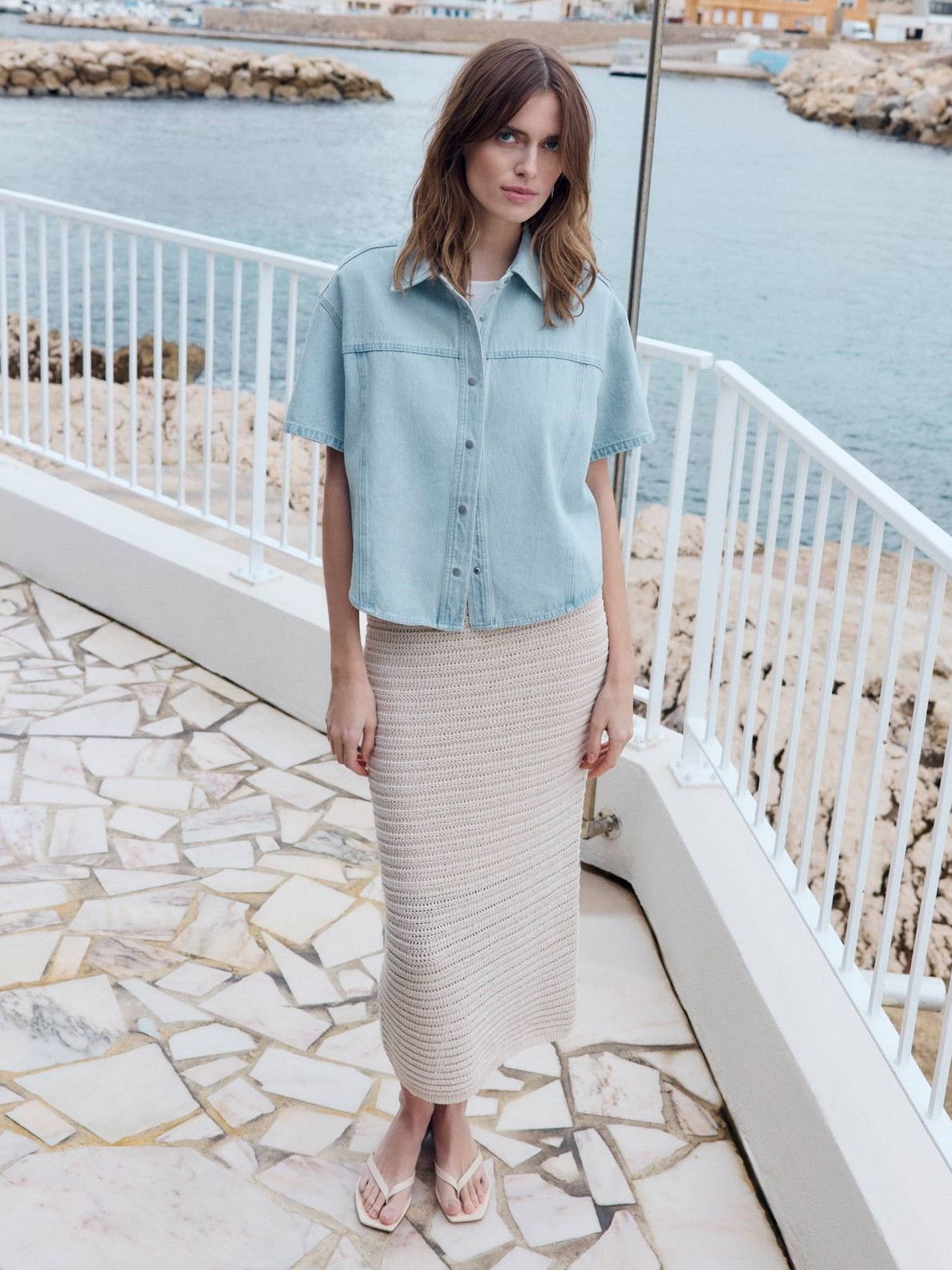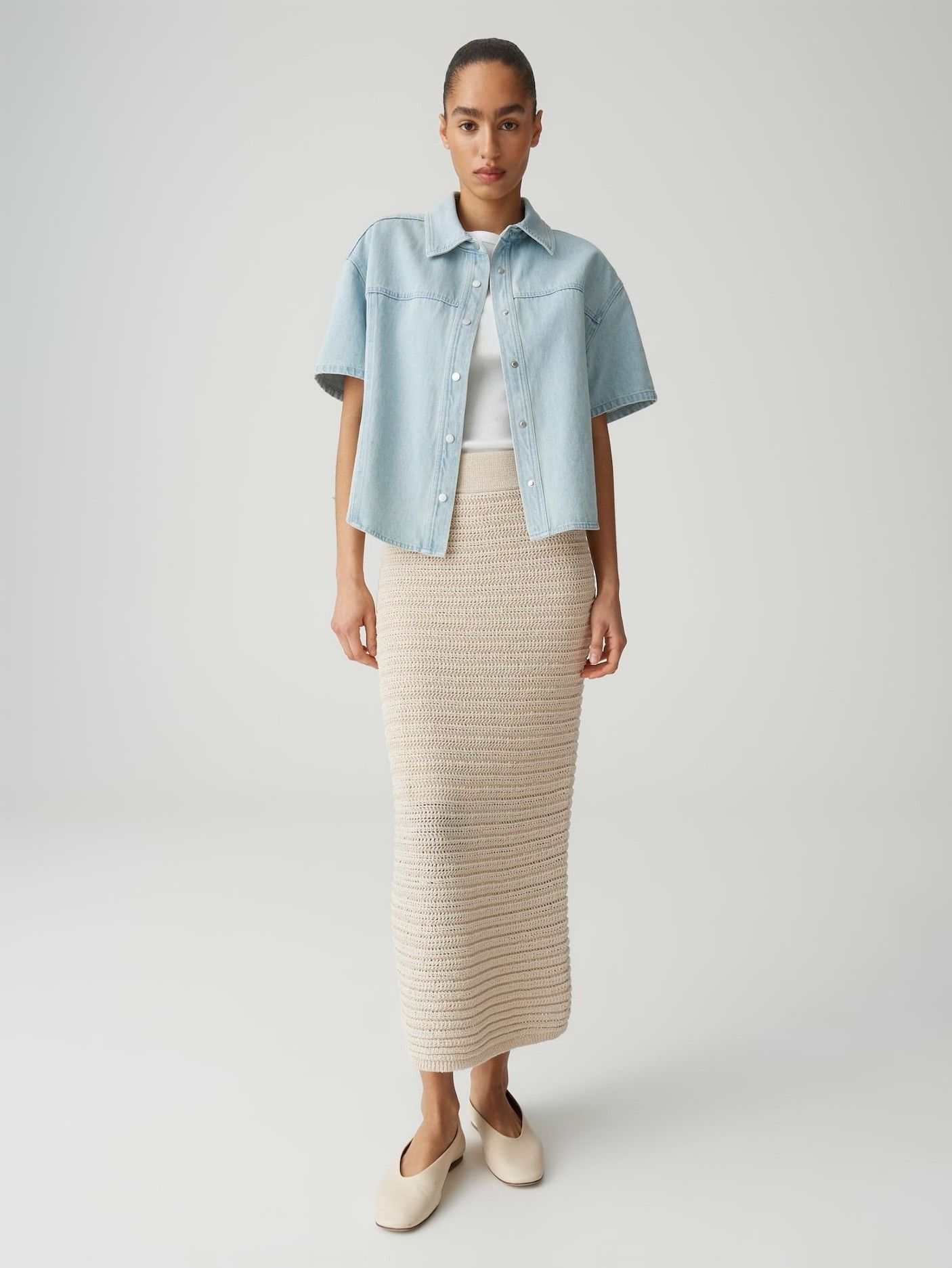 - Het model is 1.77m lang en draagt maat 38