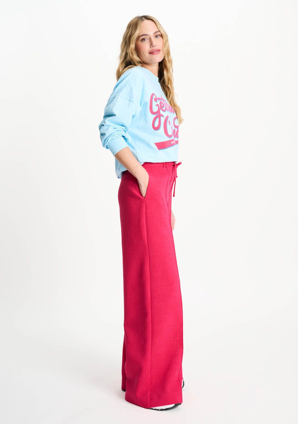 - Het model is 1.76m lang en draagt maat 36