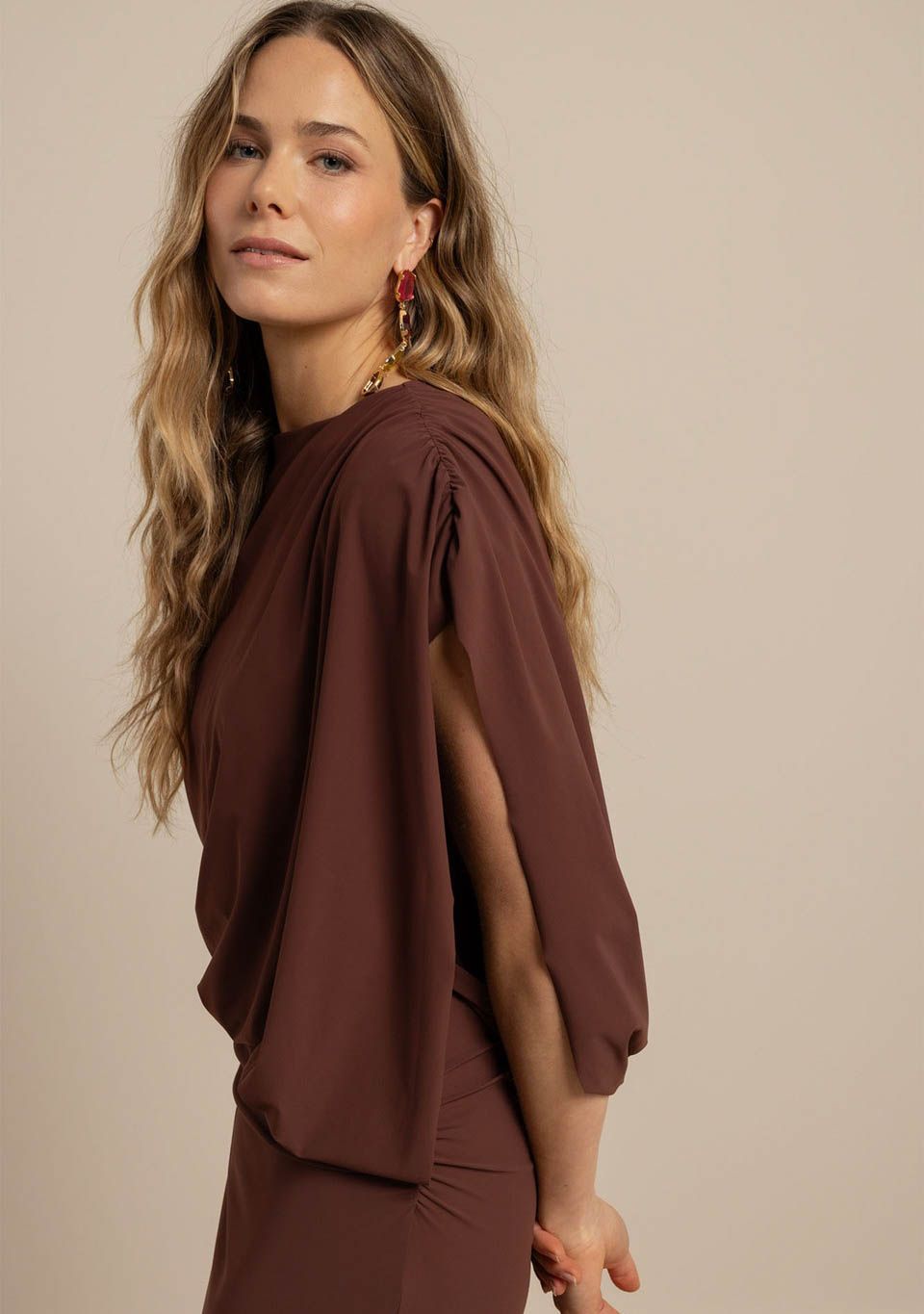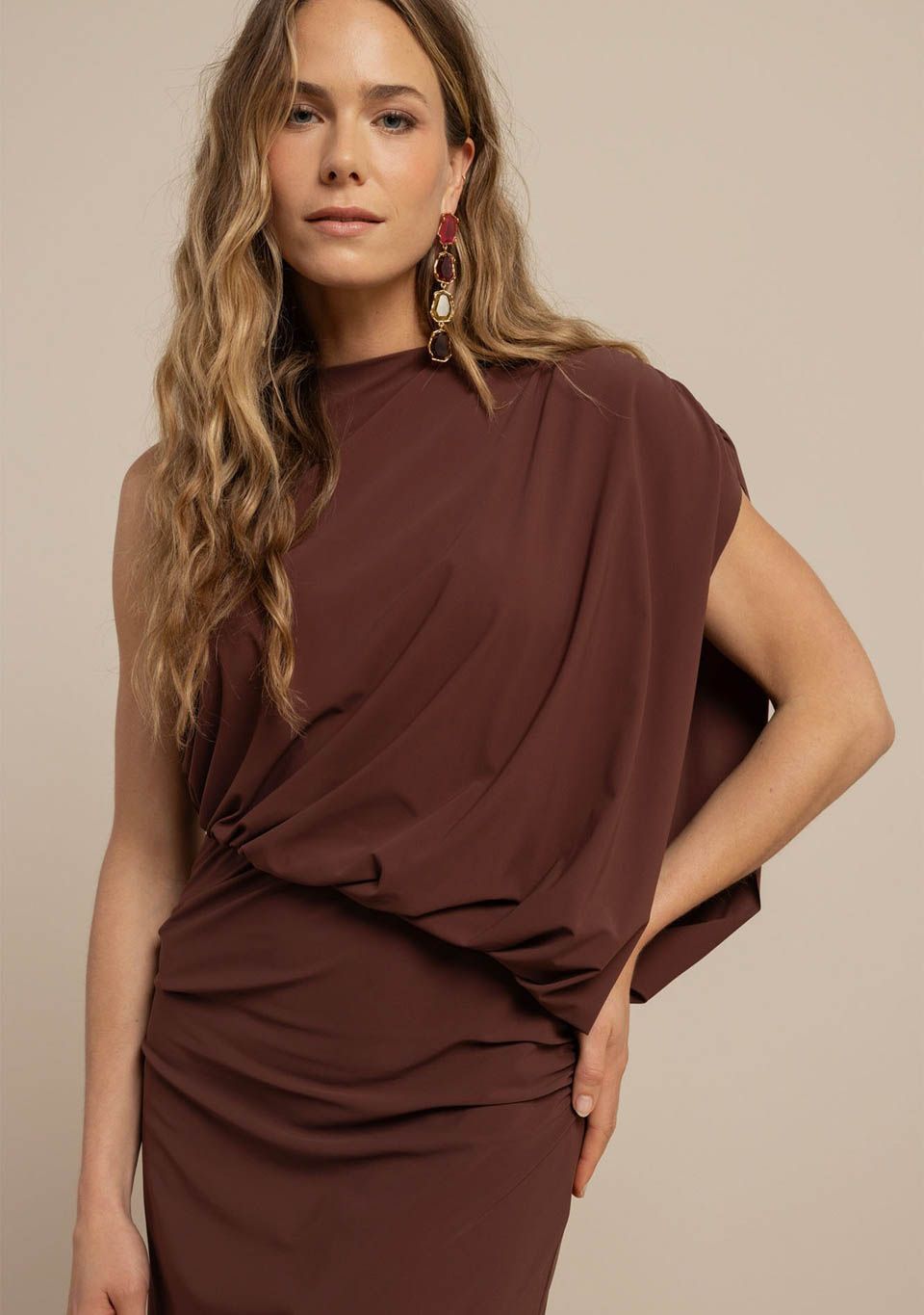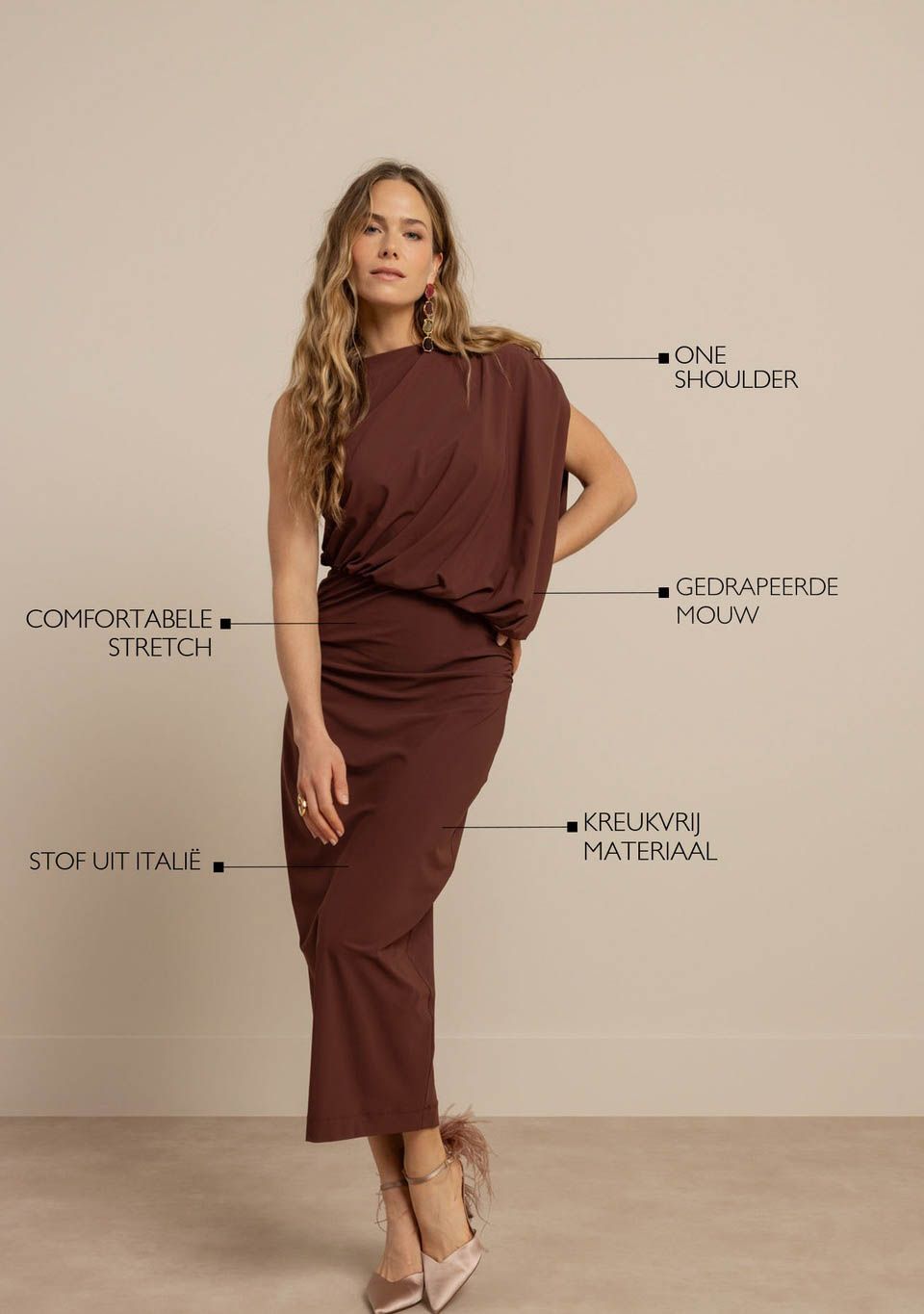 - Het model is 1.79m lang en draagt maat S