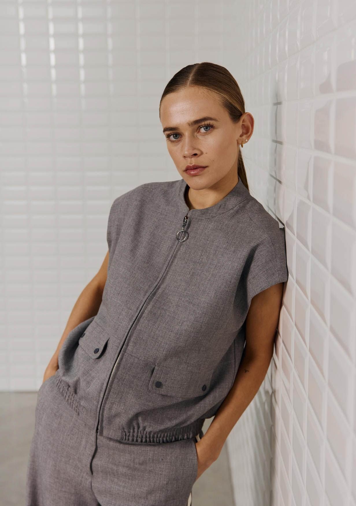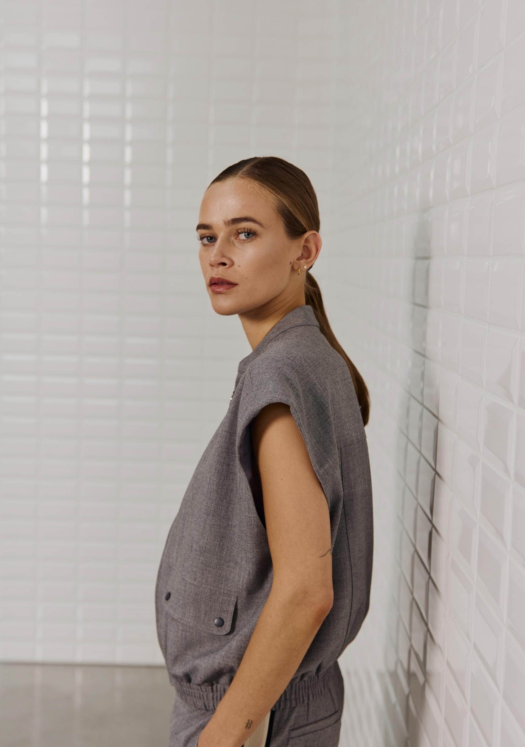 - Het model is 1.76m lang en draagt maat XS