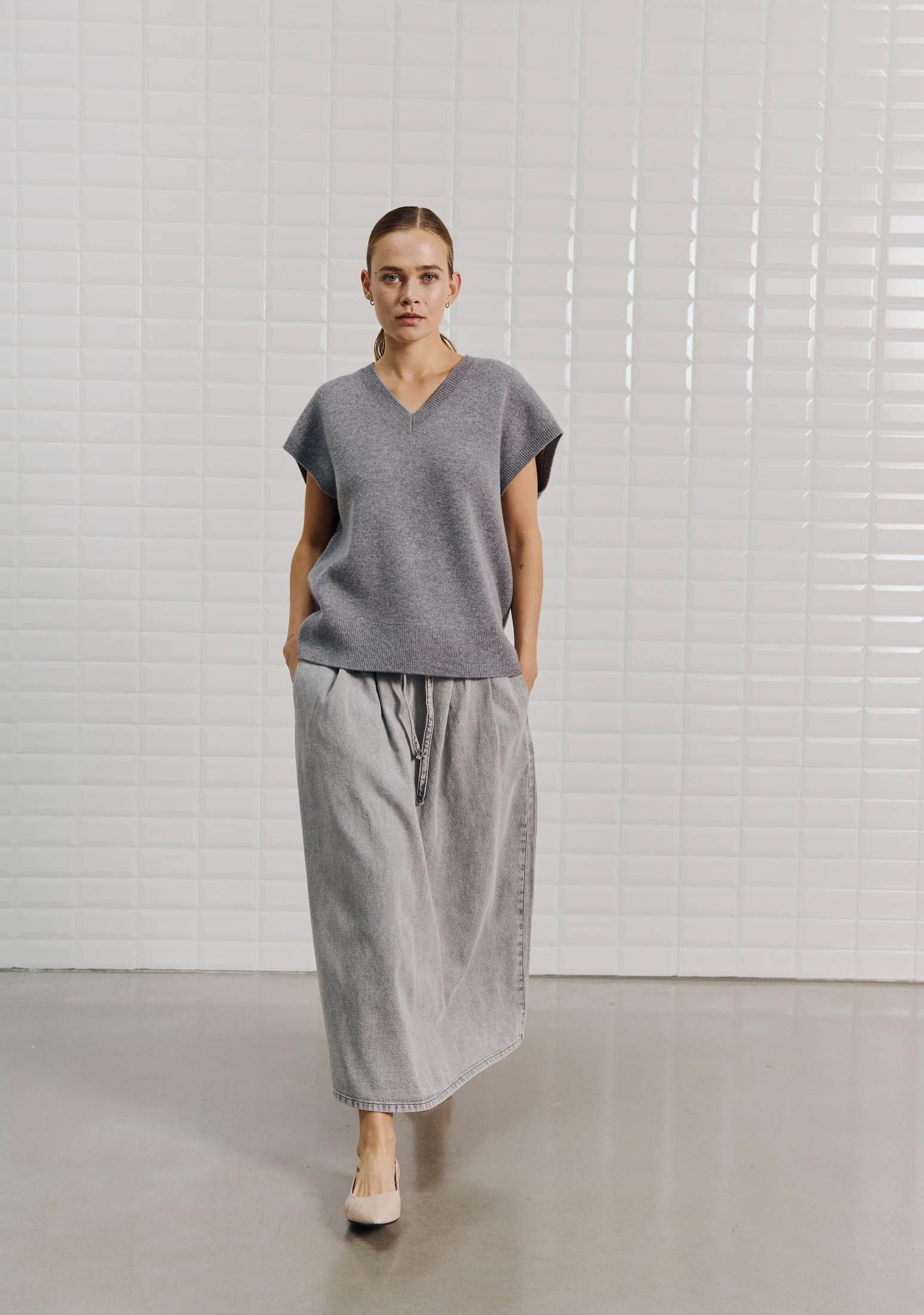 - Het model is 1.76m lang en draagt maat XS