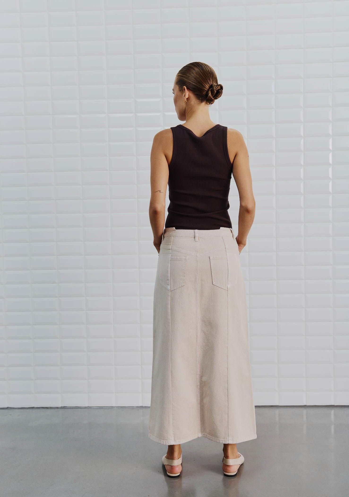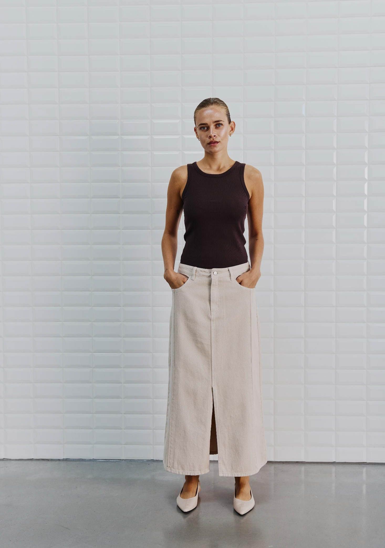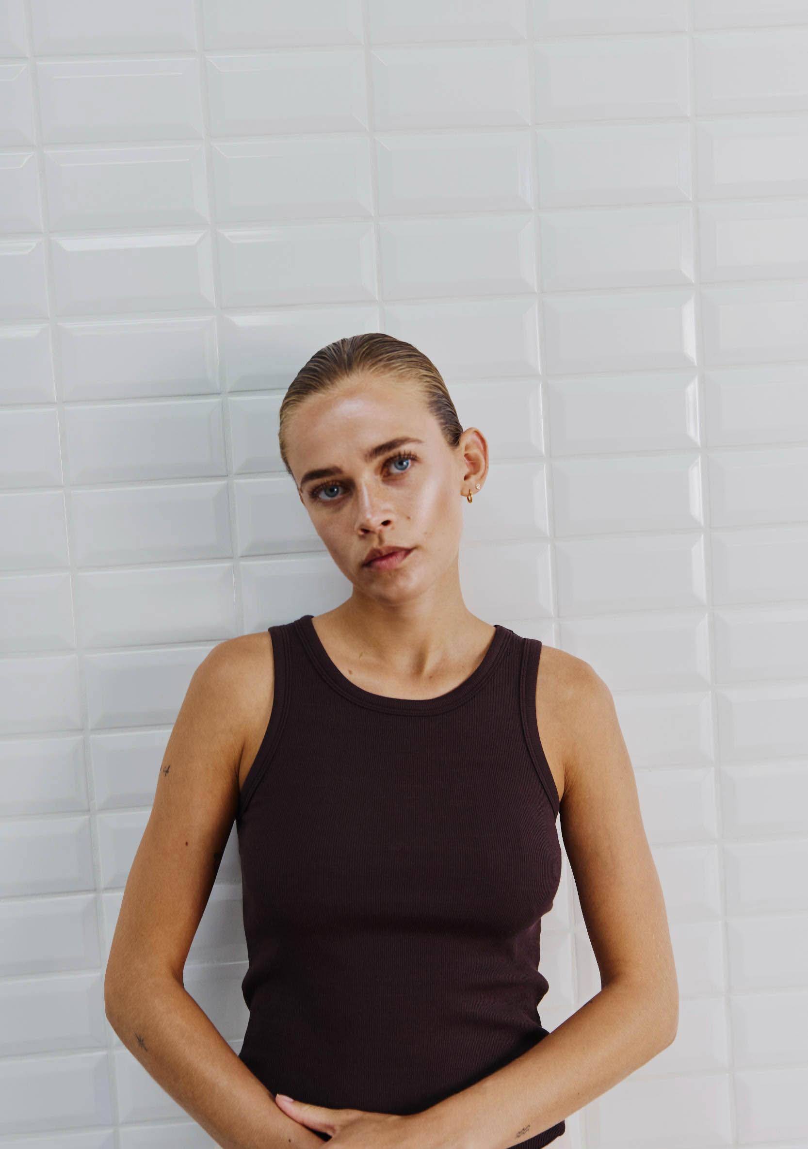 - Het model is 1.76m lang en draagt maat XS